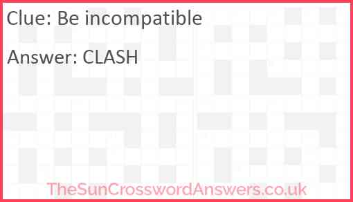 Be incompatible is a crossword clue for which we have 1 possible answer and we have spotted 1 times in our database. This crossword clue was last seen on 29 March 2024 in The Sun Coffee Time Crossword puzzle!