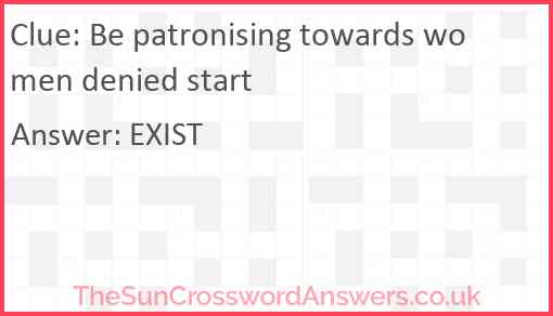 Be patronising towards women denied start is a crossword clue for which we have 1 possible answer and we have spotted 3 times in our database. This crossword clue was last seen on 04 August 2025 in The Sun Cryptic Crossword puzzle!
