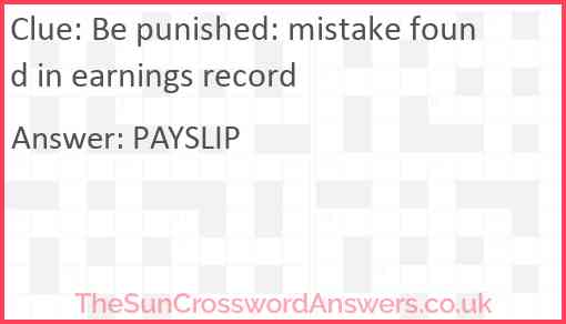 Be punished: mistake found in earnings record is a crossword clue for which we have 1 possible answer and we have spotted 2 times in our database. This crossword clue was last seen on 09 March 2023 in The Sun Cryptic Crossword puzzle!