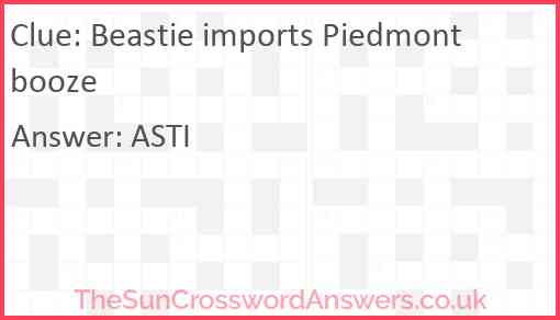 Beastie imports Piedmont booze is a crossword clue for which we have 1 possible answer and we have spotted 3 times in our database. This crossword clue was last seen on 18 August 2023 in The Sun Cryptic Crossword puzzle!