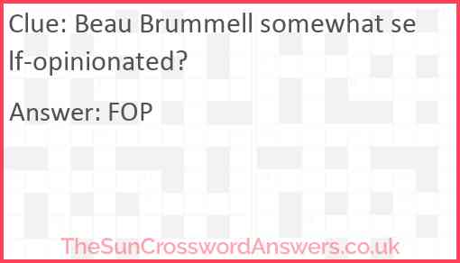Beau Brummell somewhat self-opinionated? is a crossword clue for which we have 1 possible answer and we have spotted 1 times in our database. This crossword clue was last seen on 03 July 2020 in The Sun Cryptic Crossword puzzle!