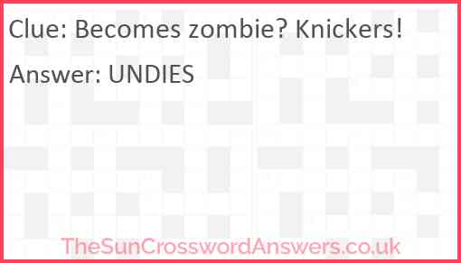 Becomes zombie? Knickers! is a crossword clue for which we have 1 possible answer and we have spotted 1 times in our database. This crossword clue was last seen on 24 May 2021 in The Sun Cryptic Crossword puzzle!
