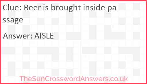 Beer is brought inside passage is a crossword clue for which we have 1 possible answer and we have spotted 5 times in our database. This crossword clue was last seen on 21 July 2023 in The Sun Cryptic Crossword puzzle!