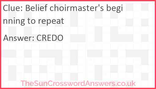Belief choirmaster's beginning to repeat is a crossword clue for which we have 1 possible answer and we have spotted 1 times in our database. This crossword clue was last seen on 11 February 2025 in The Sun Cryptic Crossword puzzle!