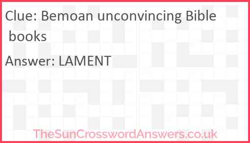 Bemoan unconvincing Bible books is a crossword clue for which we have 1 possible answer and we have spotted 2 times in our database. This crossword clue was last seen on 30 October 2022 in The Sun Cryptic Crossword puzzle!