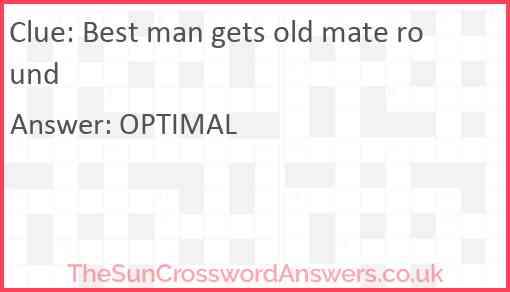 Best man gets old mate round is a crossword clue for which we have 1 possible answer and we have spotted 2 times in our database. This crossword clue was last seen on 08 June 2022 in The Sun Cryptic Crossword puzzle!