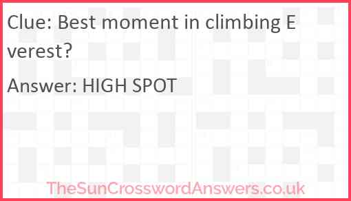 Best moment in climbing Everest? is a crossword clue for which we have 2 possible answer and we have spotted 2 times in our database. This crossword clue was last seen on 15 September 2023 in The Sun Cryptic Crossword puzzle!