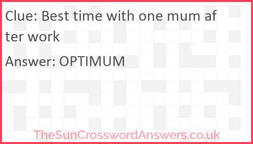 Best time with one mum after work is a crossword clue for which we have 1 possible answer and we have spotted 3 times in our database. This crossword clue was last seen on 10 February 2025 in The Sun Cryptic Crossword puzzle!