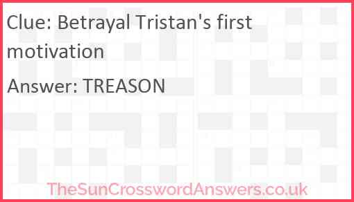 Betrayal Tristan's first motivation is a crossword clue for which we have 1 possible answer and we have spotted 2 times in our database. This crossword clue was last seen on 20 January 2025 in The Sun Cryptic Crossword puzzle!