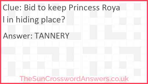 Bid to keep Princess Royal in hiding place? is a crossword clue for which we have 1 possible answer and we have spotted 2 times in our database. This crossword clue was last seen on 22 September 2024 in The Sun Cryptic Crossword puzzle!
