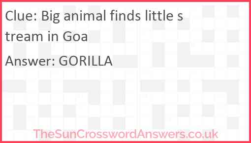Big animal finds little stream in Goa is a crossword clue for which we have 1 possible answer and we have spotted 2 times in our database. This crossword clue was last seen on 28 March 2023 in The Sun Cryptic Crossword puzzle!