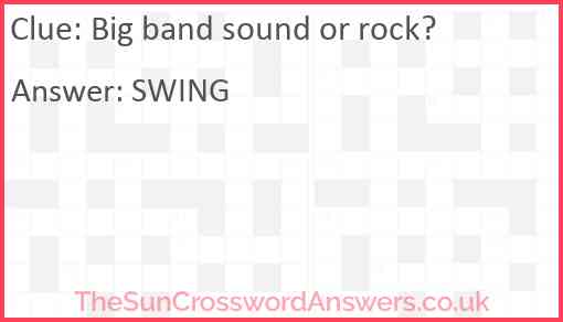 Big band sound or rock? is a crossword clue for which we have 1 possible answer and we have spotted 2 times in our database. This crossword clue was last seen on 11 September 2023 in The Sun Cryptic Crossword puzzle!