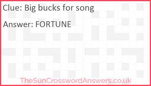 Big bucks for song is a crossword clue for which we have 1 possible answer and we have spotted 3 times in our database. This crossword clue was last seen on 03 January 2024 in The Sun Cryptic Crossword puzzle!
