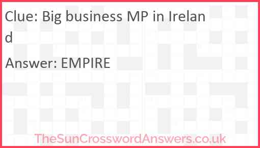 Big business MP in Ireland is a crossword clue for which we have 1 possible answer and we have spotted 1 times in our database. This crossword clue was last seen on 09 March 2020 in The Sun Cryptic Crossword puzzle!
