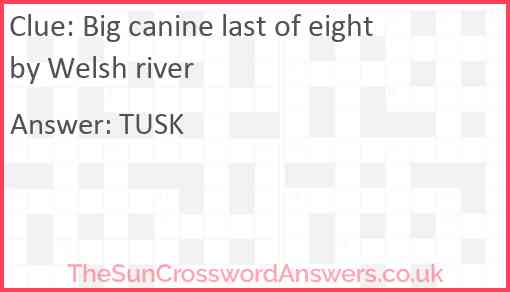 Big canine last of eight by Welsh river is a crossword clue for which we have 1 possible answer and we have spotted 1 times in our database. This crossword clue was last seen on 03 June 2023 in The Sun Cryptic Crossword puzzle!