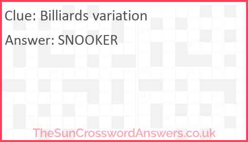 Billiards variation is a crossword clue for which we have 1 possible answer and we have spotted 2 times in our database. This crossword clue was last seen on 20 April 2025 in The Sun Coffee Time Crossword puzzle!