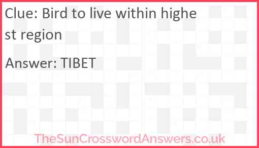 Bird to live within highest region is a crossword clue for which we have 1 possible answer and we have spotted 1 times in our database. This crossword clue was last seen on 03 February 2020 in The Sun Cryptic Crossword puzzle!