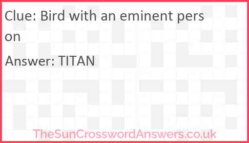 Bird with an eminent person is a crossword clue for which we have 1 possible answer and we have spotted 2 times in our database. This crossword clue was last seen on 12 May 2024 in The Sun Cryptic Crossword puzzle!