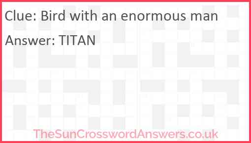 Bird with an enormous man is a crossword clue for which we have 1 possible answer and we have spotted 4 times in our database. This crossword clue was last seen on 03 December 2023 in The Sun Cryptic Crossword puzzle!