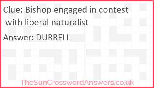 Bishop engaged in contest with liberal naturalist is a crossword clue for which we have 1 possible answer and we have spotted 1 times in our database. This crossword clue was last seen on 12 June 2023 in The Sun Cryptic Crossword puzzle!