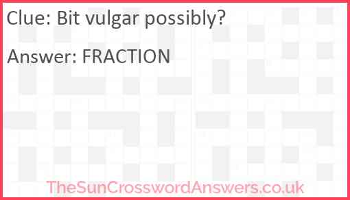 Bit vulgar possibly? is a crossword clue for which we have 1 possible answer and we have spotted 2 times in our database. This crossword clue was last seen on 10 November 2024 in The Sun Cryptic Crossword puzzle!