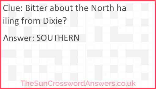 Bitter about the north hailing from Dixie? is a crossword clue for which we have 1 possible answer and we have spotted 2 times in our database. This crossword clue was last seen on 17 February 2024 in The Sun Cryptic Crossword puzzle!