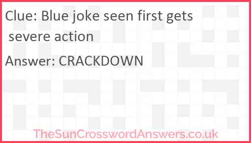 Blue joke seen first gets severe action is a crossword clue for which we have 1 possible answer and we have spotted 1 times in our database. This crossword clue was last seen on 21 May 2021 in The Sun Cryptic Crossword puzzle!