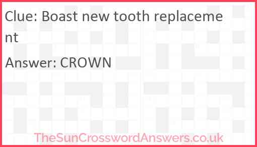 Boast new tooth replacement is a crossword clue for which we have 1 possible answer and we have spotted 3 times in our database. This crossword clue was last seen on 09 July 2024 in The Sun Cryptic Crossword puzzle!