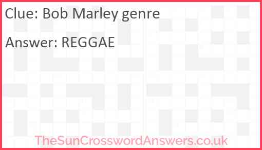 Bob Marley genre is a crossword clue for which we have 1 possible answer and we have spotted 1 times in our database. This crossword clue was last seen on 27 November 2021 in The Sun Coffee Time Crossword puzzle!