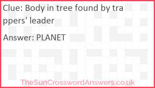 Body in tree found by trappers' leader is a crossword clue for which we have 1 possible answer and we have spotted 2 times in our database. This crossword clue was last seen on 27 October 2024 in The Sun Cryptic Crossword puzzle!