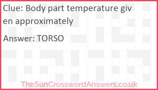 Body part temperature given approximately is a crossword clue for which we have 1 possible answer and we have spotted 2 times in our database. This crossword clue was last seen on 16 December 2023 in The Sun Cryptic Crossword puzzle!