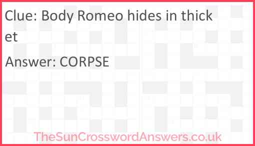 Body Romeo hides in thicket is a crossword clue for which we have 1 possible answer and we have spotted 2 times in our database. This crossword clue was last seen on 23 March 2024 in The Sun Cryptic Crossword puzzle!