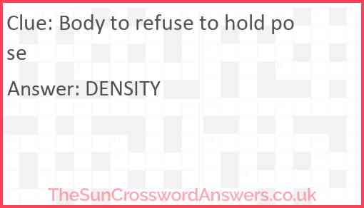 Body to refuse to hold pose is a crossword clue for which we have 1 possible answer and we have spotted 3 times in our database. This crossword clue was last seen on 11 June 2023 in The Sun Cryptic Crossword puzzle!