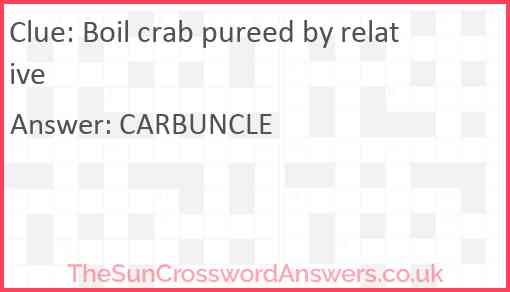 Boil crab pureed by relative is a crossword clue for which we have 1 possible answer and we have spotted 2 times in our database. This crossword clue was last seen on 27 April 2025 in The Sun Cryptic Crossword puzzle!