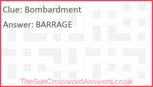 Bombardment is a crossword clue for which we have 1 possible answer and we have spotted 14 times in our database. This crossword clue was last seen on 05 May 2025 in The Sun Coffee Time Crossword puzzle!