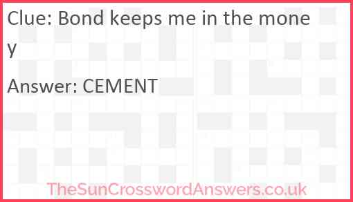 Bond keeps me in the money is a crossword clue for which we have 1 possible answer and we have spotted 2 times in our database. This crossword clue was last seen on 10 September 2022 in The Sun Cryptic Crossword puzzle!