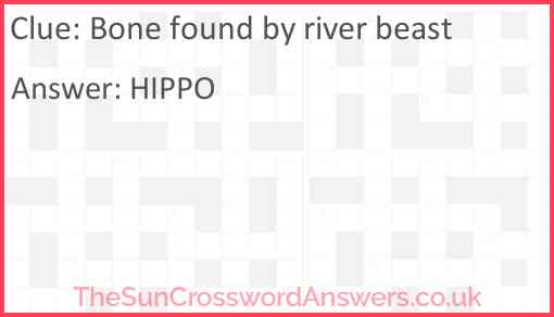 Bone found by river beast is a crossword clue for which we have 1 possible answer and we have spotted 3 times in our database. This crossword clue was last seen on 15 September 2023 in The Sun Cryptic Crossword puzzle!