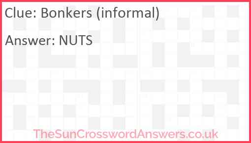 Bonkers (informal) is a crossword clue for which we have 1 possible answer and we have spotted 1 times in our database. This crossword clue was last seen on 29 October 2019 in The Sun Coffee Time Crossword puzzle!