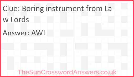 Boring instrument from Law Lords is a crossword clue for which we have 1 possible answer and we have spotted 2 times in our database. This crossword clue was last seen on 21 May 2023 in The Sun Cryptic Crossword puzzle!