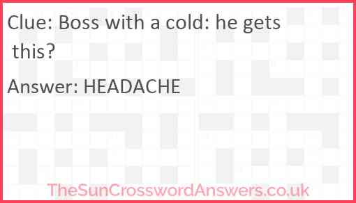 Boss with a cold: he gets this? is a crossword clue for which we have 1 possible answer and we have spotted 3 times in our database. This crossword clue was last seen on 17 May 2024 in The Sun Cryptic Crossword puzzle!