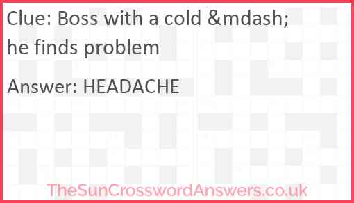 Boss with a cold — he finds problem is a crossword clue for which we have 1 possible answer and we have spotted 1 times in our database. This crossword clue was last seen on 03 January 2020 in The Sun Cryptic Crossword puzzle!