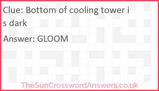 Bottom of cooling tower is dark is a crossword clue for which we have 1 possible answer and we have spotted 1 times in our database. This crossword clue was last seen on 08 September 2020 in The Sun Cryptic Crossword puzzle!