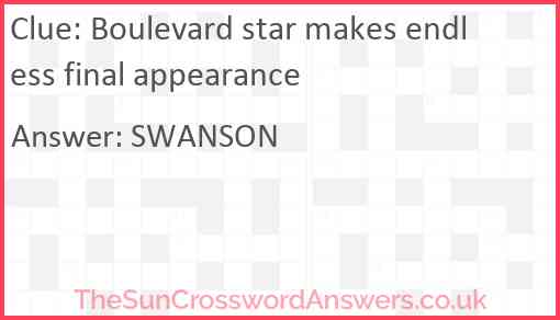 Boulevard star makes endless final appearance is a crossword clue for which we have 1 possible answer and we have spotted 1 times in our database. This crossword clue was last seen on 25 February 2019 in The Sun Cryptic Crossword puzzle!