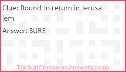Bound to return in Jerusalem is a crossword clue for which we have 1 possible answer and we have spotted 2 times in our database. This crossword clue was last seen on 21 August 2024 in The Sun Cryptic Crossword puzzle!