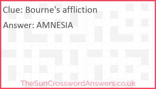 Bourne's affliction is a crossword clue for which we have 1 possible answer and we have spotted 1 times in our database. This crossword clue was last seen on 23 August 2024 in The Sun Coffee Time Crossword puzzle!
