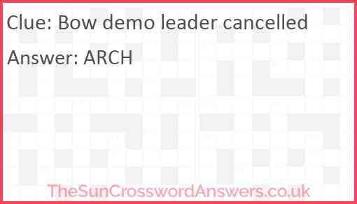 Bow demo leader cancelled is a crossword clue for which we have 1 possible answer and we have spotted 2 times in our database. This crossword clue was last seen on 28 November 2023 in The Sun Cryptic Crossword puzzle!