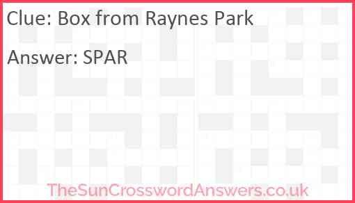 Box from Raynes Park is a crossword clue for which we have 1 possible answer and we have spotted 3 times in our database. This crossword clue was last seen on 16 September 2024 in The Sun Cryptic Crossword puzzle!