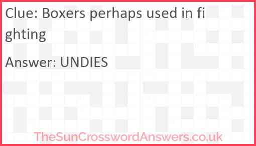 Boxers perhaps used in fighting is a crossword clue for which we have 1 possible answer and we have spotted 2 times in our database. This crossword clue was last seen on 26 November 2023 in The Sun Cryptic Crossword puzzle!