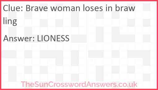 Brave woman loses in brawling is a crossword clue for which we have 1 possible answer and we have spotted 1 times in our database. This crossword clue was last seen on 09 August 2021 in The Sun Cryptic Crossword puzzle!