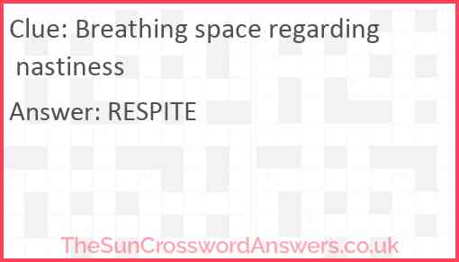 Breathing space regarding nastiness is a crossword clue for which we have 1 possible answer and we have spotted 2 times in our database. This crossword clue was last seen on 30 January 2024 in The Sun Cryptic Crossword puzzle!